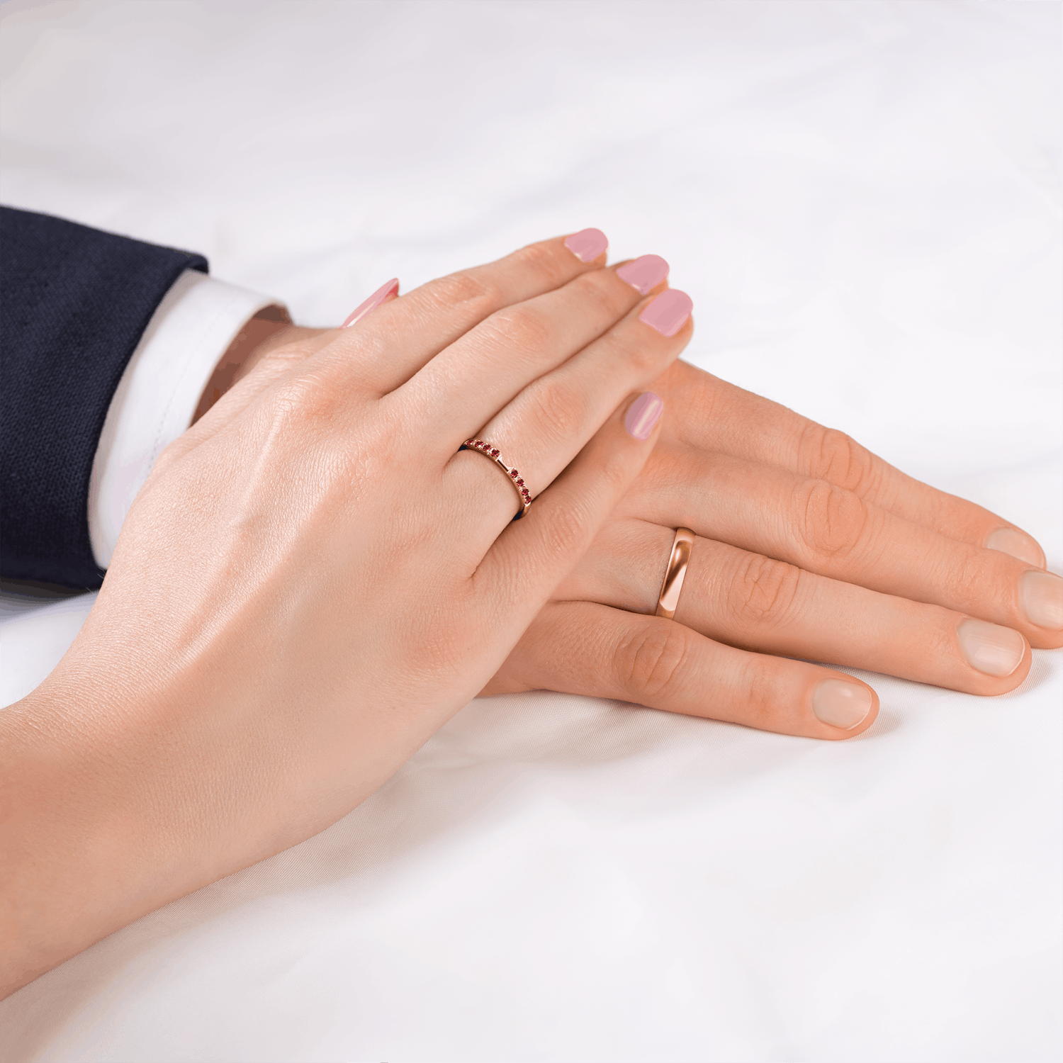 A különlegesen kialakított esküvői karikagyűrű tökéletesen illeszkedik az eljegyzési gyűrűhöz, így egy eredeti ékszer-kompozíciót alkotnak.