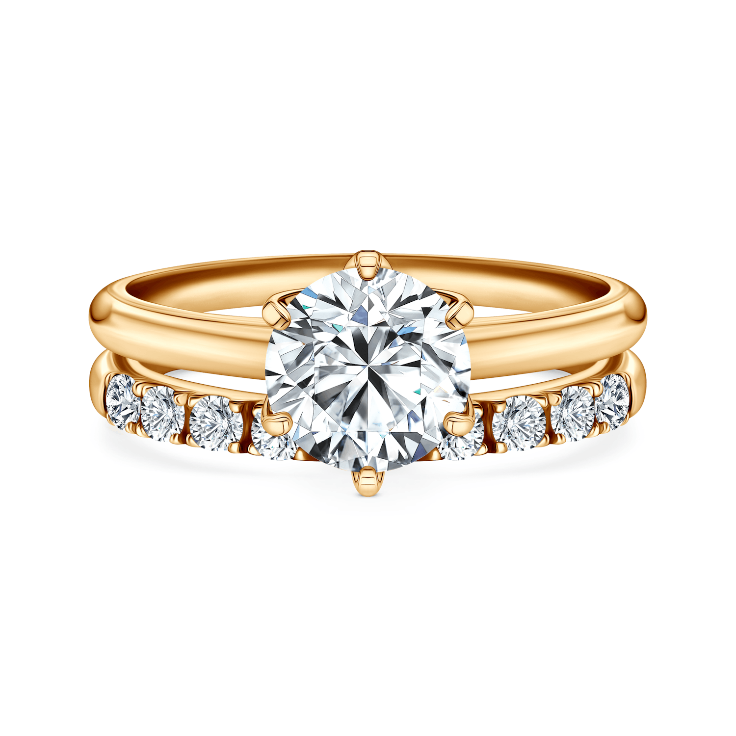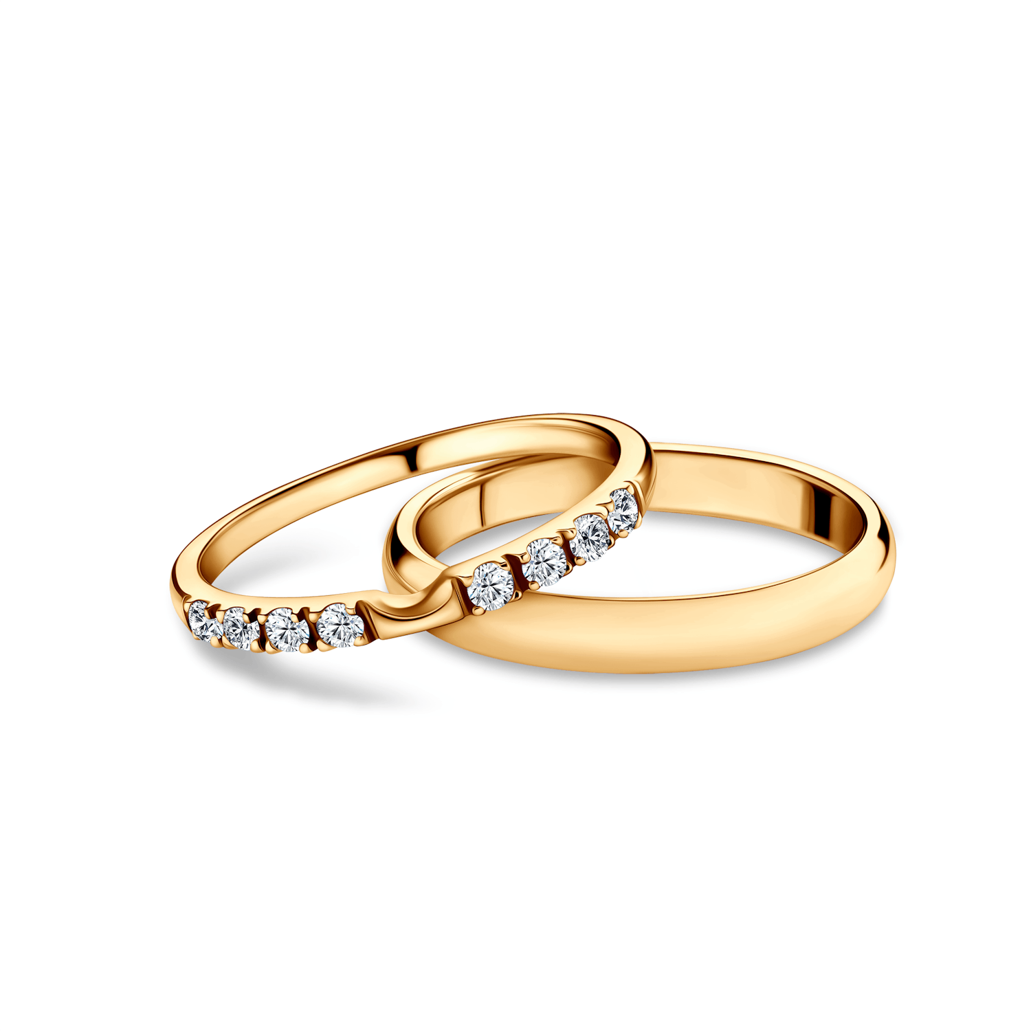 A különlegesen kialakított esküvői karikagyűrű tökéletesen illeszkedik az eljegyzési gyűrűhöz, így egy eredeti ékszer-kompozíciót alkotnak.